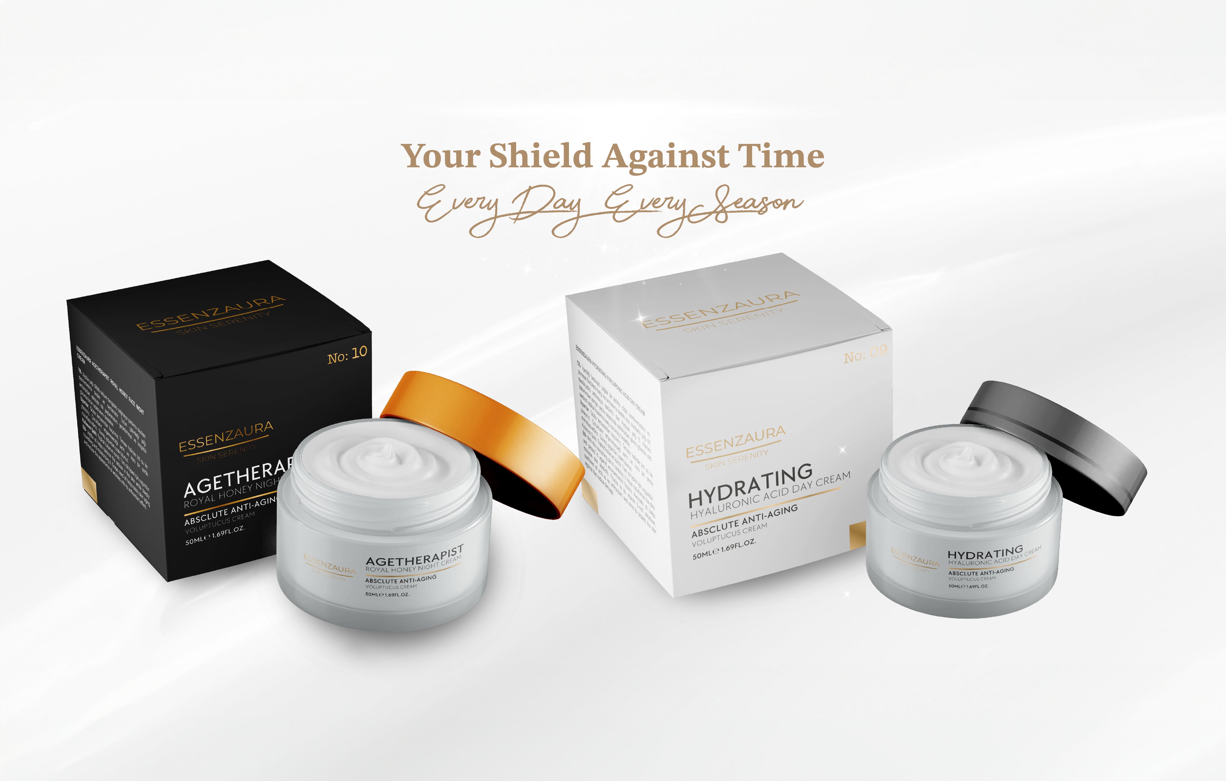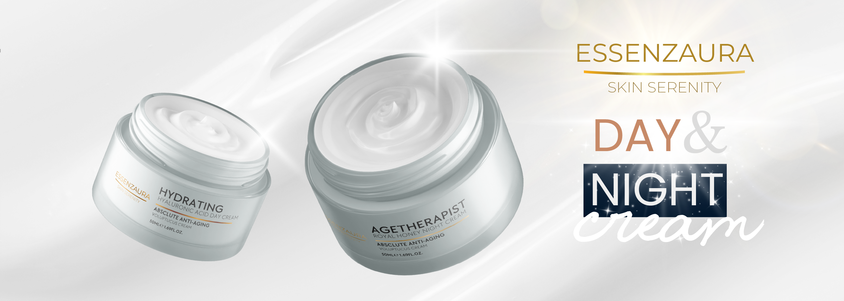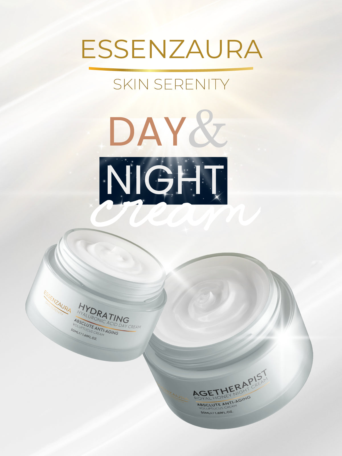 Shop Now!Discover the dual power of Essenzaura's Day and Night Creams. Hydrate and protect by day with our Hyaluronic Acid Day Cream; rejuvenate and repair by night with Royal Honey Night Cream. Each formula is a blend of nature's finest, designed to enhance your skin's natural beauty. Feel the difference with every application—experience a radiant, youthful complexion with Essenzaura.